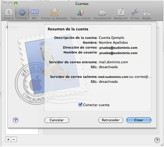 Paso 8. En este paso se pide confirmación de los pasos anterior, en el caso de que se todo este correctamente configurado ya se tiene la cuenta creada y configurada en Mail.